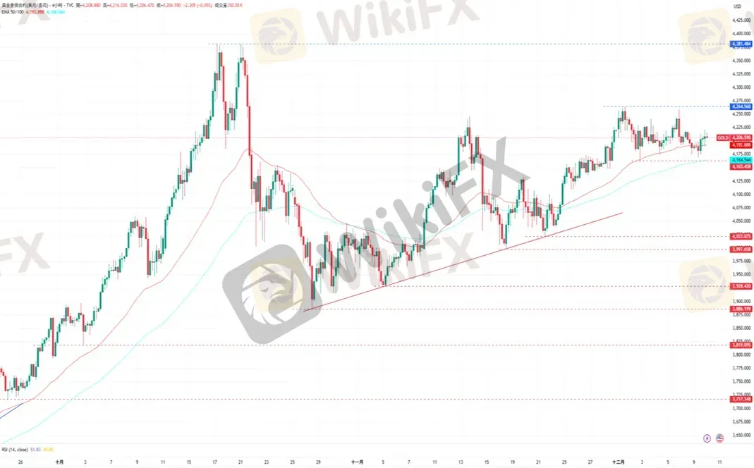 CPT Markets分析师指出,黄金价格依靠在EMA50均线的动态支撑上方盘整,以试图突破4264美元的阻力水平。上涨方面,黄金目前的阻力为12月1日高点4264美元,再来是10月21日高点4381美元。下跌方面,黄金目前的支撑为12月2日的低点4163美元,再来是11月21日的低点4022美元。