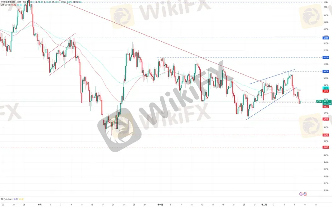 WTI原油受早前形成的反转型态影响,价格持续保持在EMA50下方交易。下跌方面,WTI原油目前的支撑为12月9日的低点58.12美元,再来是11月25日的低点57.10美元。上涨方面,若价格回升至EMA50均线上方,WTI原油目前的阻力为12月5日的高点60.50美元,再来11月03日的高点61.50美元。