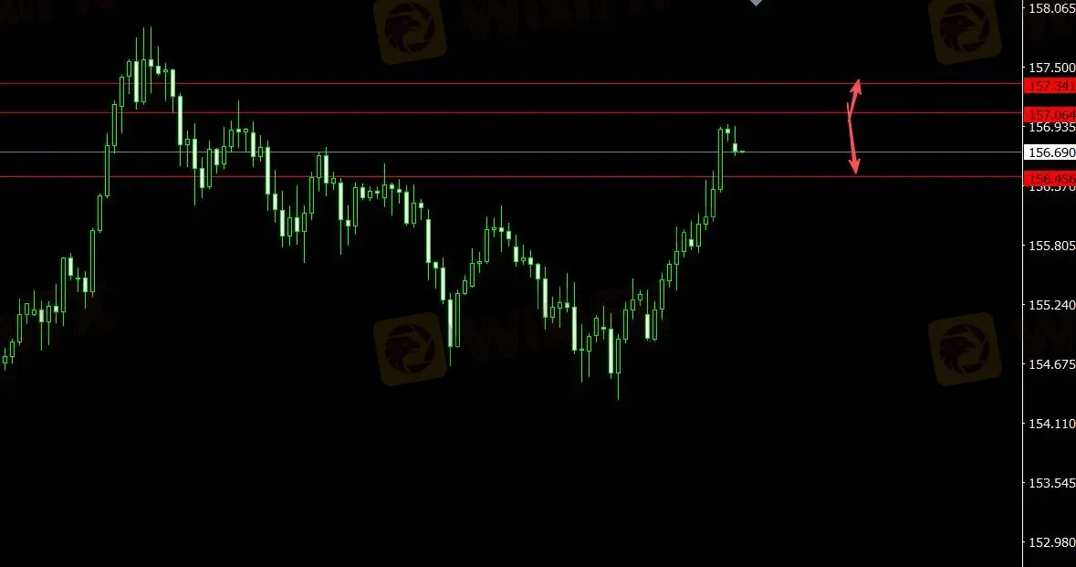 美元指数受支撑,日元承压,关注支撑位156.460,4小时看多至157.340;关注压力位157.060,4小时看空至156.270。