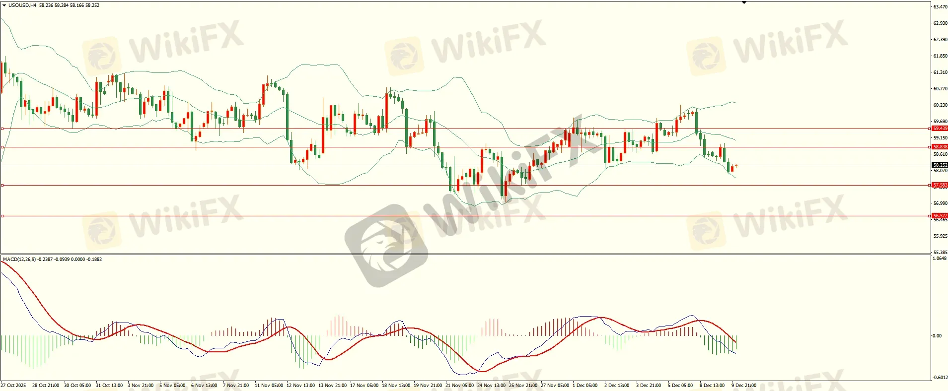 原油昨日反弹至第一阻力下方延续走低,纽约盘时段回落至第一支撑小幅反弹,日线再度报收阴线,目前下方紧邻前低支撑区,失守后方可继续,从4H来看,布林中轨拐头向下,MACD零轴附近运行,日内上方首要阻力58.85,第二阻力59.45,下方支撑57.50-60,56.55,保持在第一阻力下方短线有望测试第一支撑。