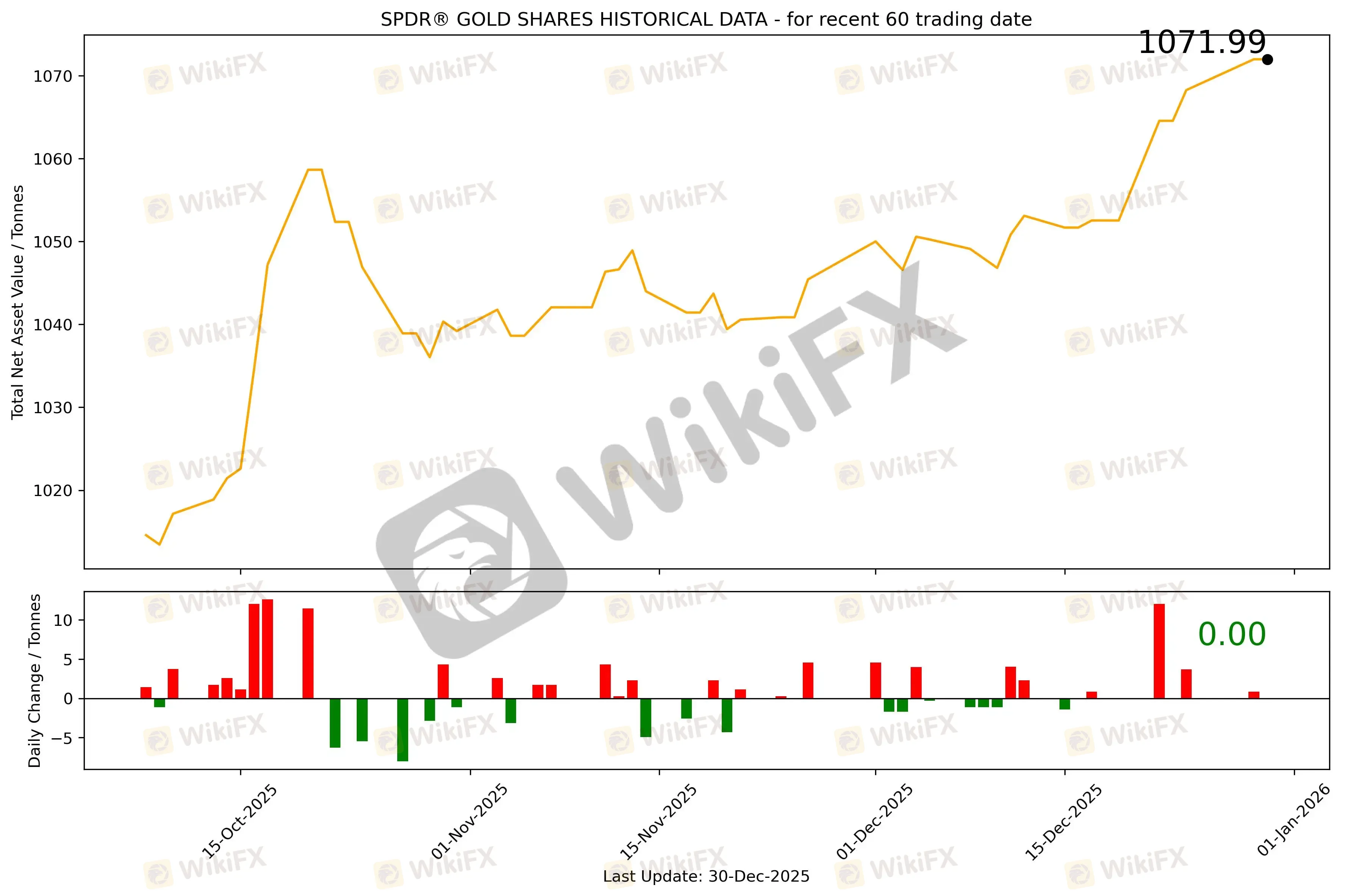 截至12月30日,全球最大的黄金ETF SPDR Gold Trust持仓量为1071.99吨,与上一个交易日增加维持不变。12月30日现货黄金自4431.71美元/盎司开盘后先涨后跌,盘中一度突破4400美元关口,最高向上触及4404.41美元/盎司,随后震荡下行。最终收于4339.34美元/盎司,涨6.05美元或0.14%。