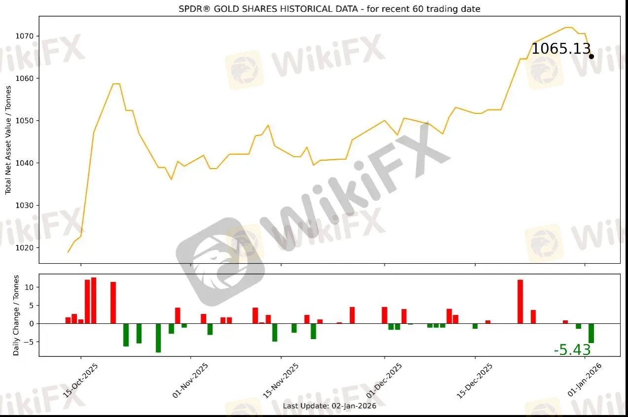 截至2026年1月2日,全球最大的黄金ETF SPDR Gold Trust持仓量为1065.13吨,较上一个交易日减少5.43吨。2026年1月2日现货黄金自4318.27美元/盎司跳空高开后震荡上行,盘中一度突破4400美元关口后跌落,回吐全部涨幅,最高向上触及4402.354美元/盎司,最低向下触及4309.6美元/盎司。最终收于4331.575美元/盎司,涨13.626美元或0.32%。