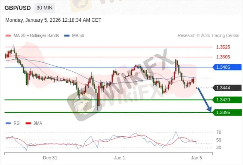 技术点评: 只要1.3485阻力位不被突破,向下跌破1.3420位置的风险很高。