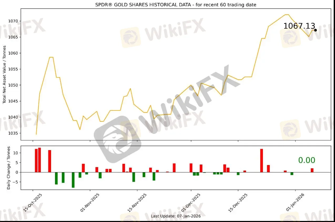 截至2026年1月7日,全球最大的黄金ETF SPDR Gold Trust持仓量为1067.13吨,与上一个交易日保持不变。2026年1月7日现货黄金自4495.01美元/盎司开盘后延续前一日涨势,最高向上触及4500.64美元/盎司,为一周内首次试探4500美元关口。随后全天震荡下行,最低向下触及4423.663美元/盎司,最终收于4456.24美元/盎司,跌38.77美元或0.86%。