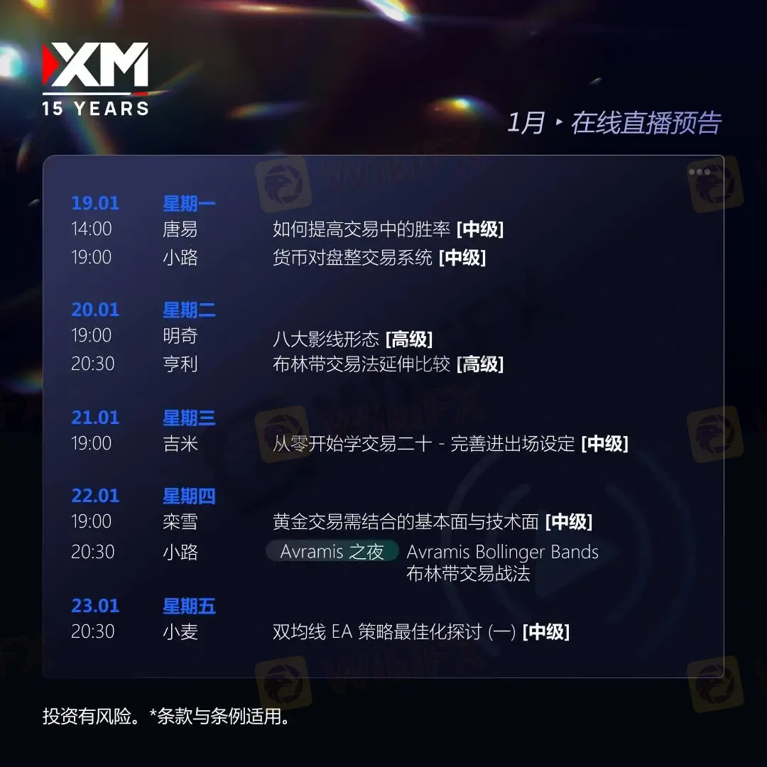 摘要:📢 2026年序幕开启,市场进入新节奏。在审慎判断趋势的基础上,稳稳抓住关键机会,为新一年的交易奠定坚实基础!XM中文直播课堂—— 每周一至周五,1小时+实战课程,从底层逻辑到实盘操作,带你建立正确、高效、可执行的交易思维,让交易能力真正再提升一个台阶!🌟 本周重点推荐课程 — 黄金交易需结合的基本面与技术面【中级】,全面解析黄金的多重属性,指导如何在交易中有效结合基本面与技术面进行决策。 锁