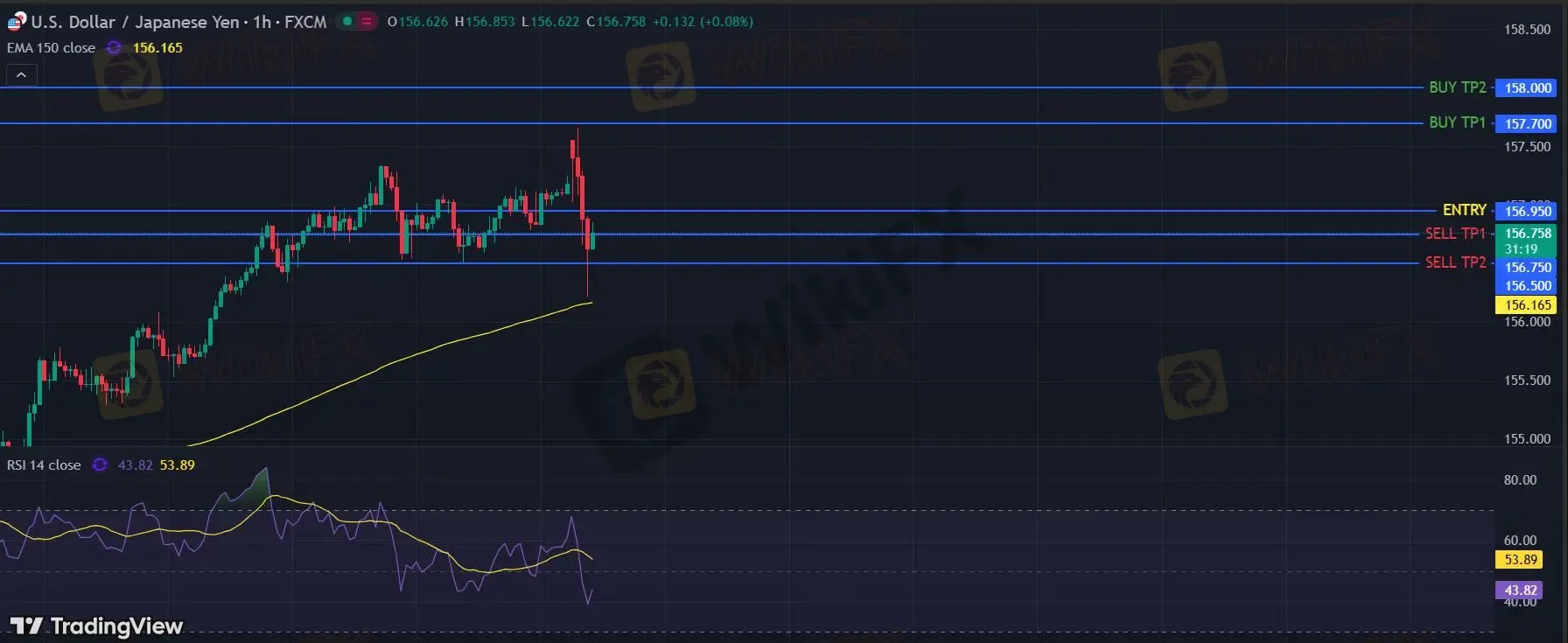 在 156.95 下,看空,目标价位定在 156.75 ,然后为 156.50。