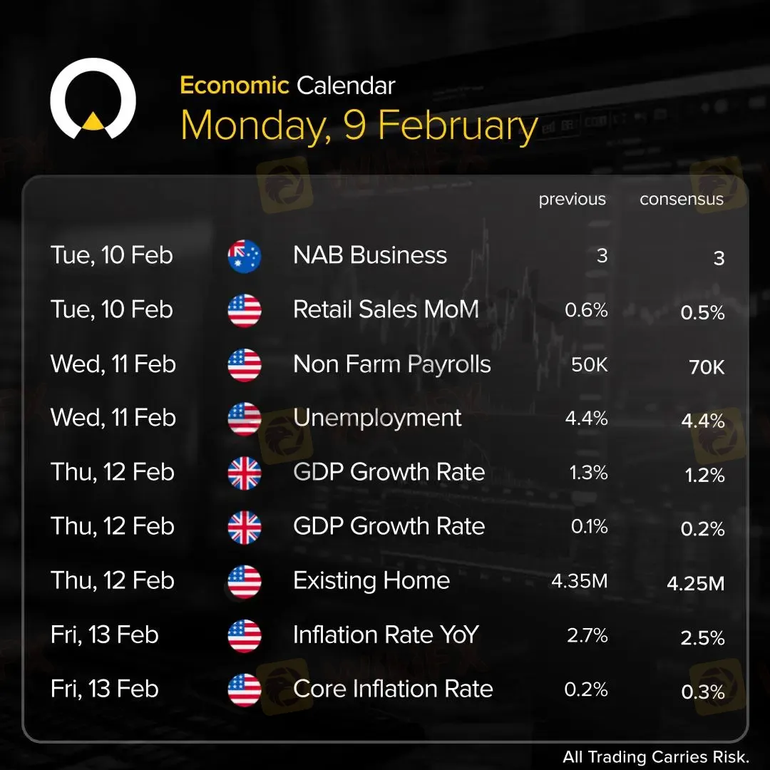 摘要:新一周市场将迎来多项关键经济数据的密集发布,以下是2月10日至13日的主要事件与预期,供各位交易者参考。📅 核心事件速览:周二(2月10日):澳大利亚NAB商业信心指数、美国零售销售月率周三(2月11日):美国非农就业人数、失业率周四(2月12日):美国GDP增长率初值、成屋销售数据周五(2月13日):美国通胀率年率及核心通胀率月率📊 重点关注:本周焦点将落在美国劳动力市场与通胀数据上。非农就