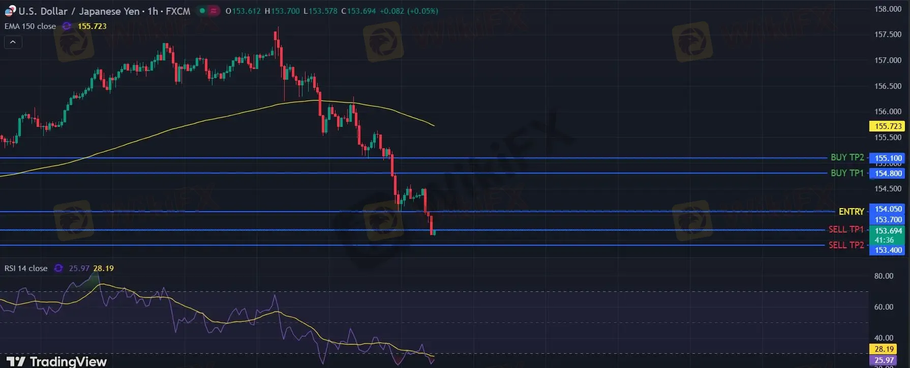在 154.05 下,看空,目标价位定在 153.70 ,然后为 153.40。