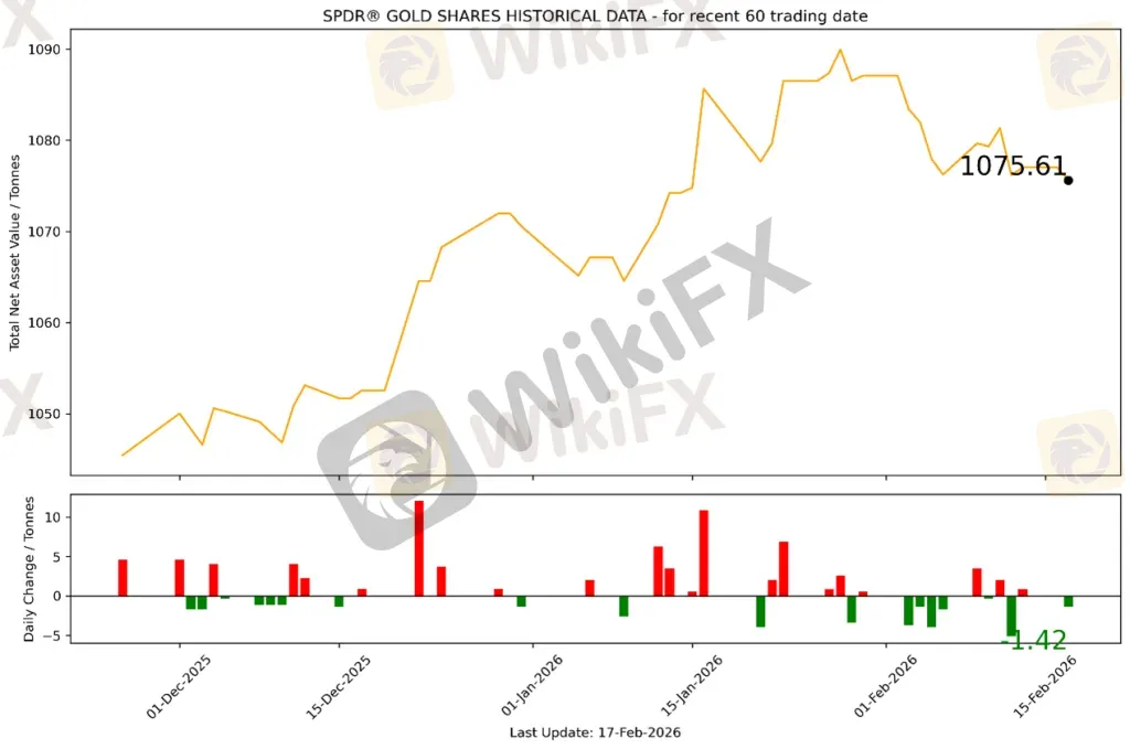 截至2026年2月17日,全球最大的黄金ETF SPDR Gold Trust持仓量为1075.61吨,较上一个交易日减少1.42吨。2026年2月17日现货黄金自4995.6美元/盎司开盘后短暂上摸5000美元关口,随后全天震荡下行。盘中三次急跌,最低向下触及4841.67美元/盎司后低位震荡,最终收于4878.98美元/盎司,跌163.22美元或3.24%。