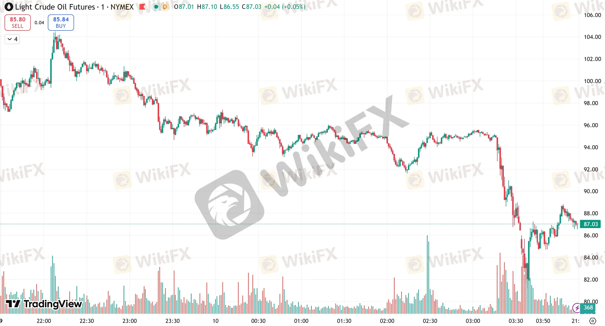 周二亚市早盘,现货黄金交投于 5150 美元/盎司附近,金价周一下跌,主要受美元走强及市场对利率上升的预期升温打压;美原油交投于 87.70 美元/桶附近,油价周一冲高回落,盘中一度飙升逾 30 %,逼近 129 美元/桶关口,但因特朗普政府正考虑进一步放松对俄罗斯的石油制裁以抑制油价,同时特朗普暗示对伊朗的“战争已基本结束”,以及各国考虑释放石油储备,限制了油价涨幅。