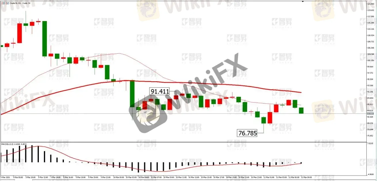 日线上,隔夜行情进一步下行且收阴线,显示行情偏弱势。4小时线上,行情回调测试62日均线若企稳则行情有望再度走高,否则警惕进一步下行风险。日内关注上方91美元一线压力。
