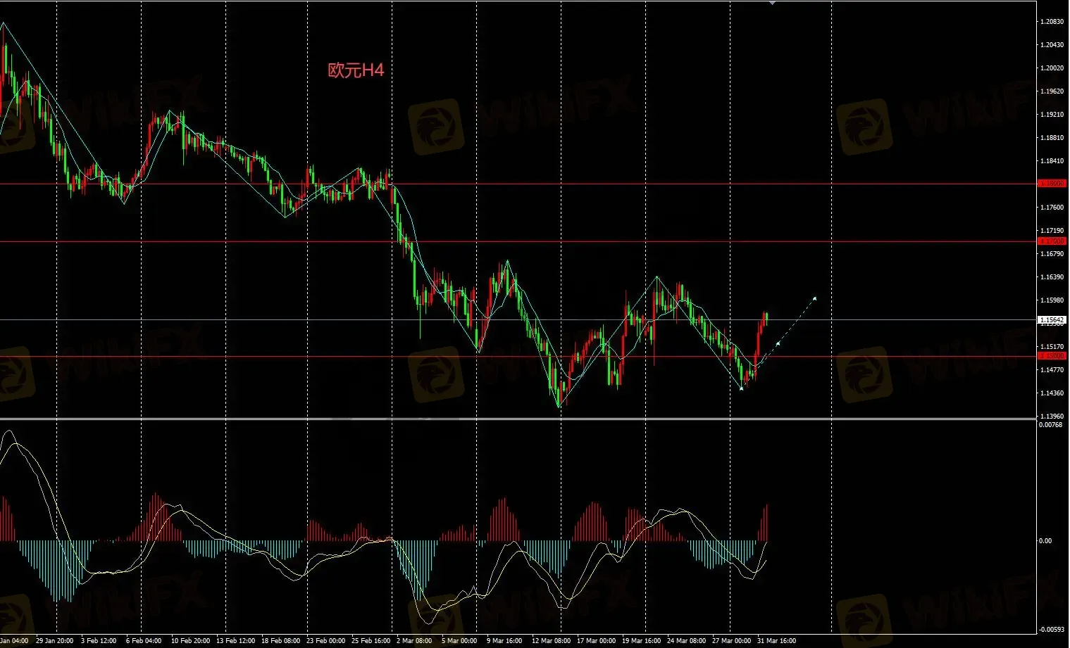 H4图表汇价,处于下跌后的反弹走势,昨日快速拉升,短期内宜观望,如果汇价回调后仍然维持在1.15上方可轻仓介入多头;目标1.17甚至1.18。