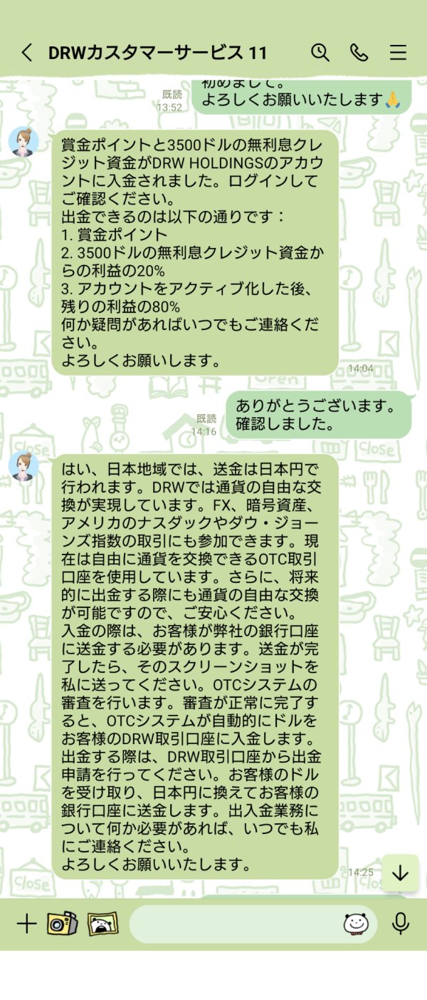 すべてLINEでのやり取りです。初回は3500ドル無償で融資、半分利益を得ると3500ドルは回収されます。利益の2割は出金出来ますが、3500ドル入力しないと取引出来ません。親に借金して入力しました。少し利益が出たので6100ドル出金申請しましたが、カスタマーサービスから本人確認に不備があるということで免許証の画像を送りました。審査が通ると出金出来るとありましたが、連絡がなかったため、こちらから尋ねてみると、LINEをブロックされました。アシスタントもブロックされています。グループLINEも削除され、連絡手段がなくなってしまいました。今すぐに6100ドル分返して欲しいです。