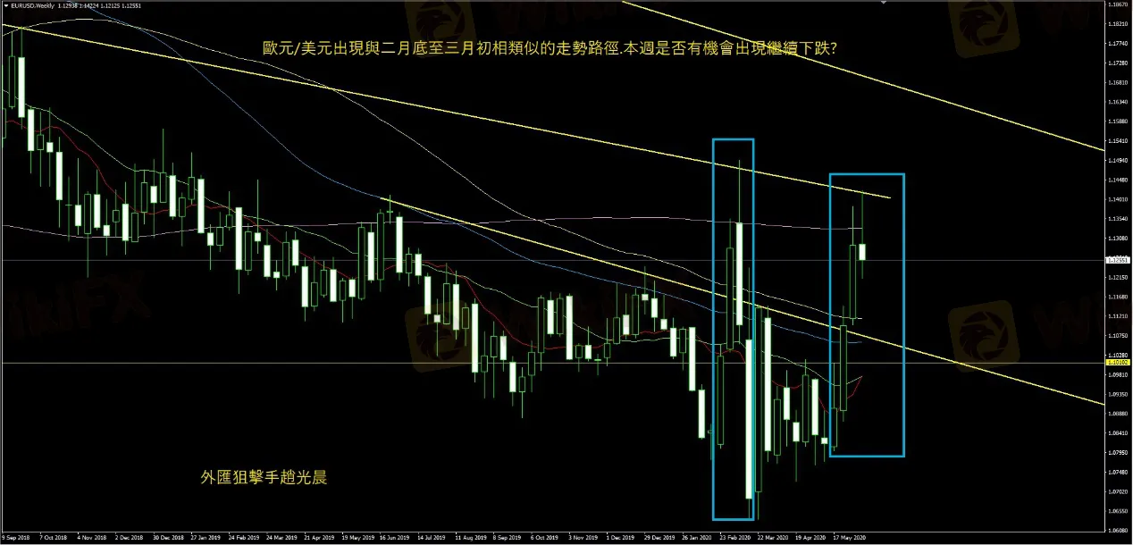 歐元/美元上週週K出現上引線收黑.其路徑與三月份創新高1.1495後回落相類似.相同劇本是否會重複上演?值得期待.目前上方壓力在1.1280.下方支撐在1.1220.