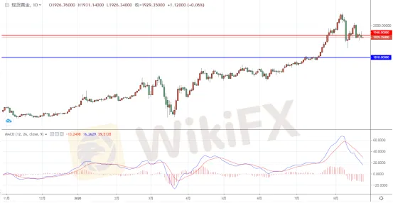 Economies.com稱,假如金價確認跌破1929.50美元/盎司支撐,這將完成頭肩頂形態的構建。在這種情況下,金價可能進一步跌向看空目標。