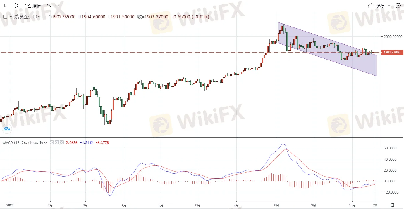 黃金方面,週二(10月20日)亞市早盤,現貨黃金繼昨天沖高回落後今天再度試圖上攻,小幅走高,目前金價仍位於1900關口上方,暫報1903.33美元/盎司,由於有消息稱美國國會將在2020年總統大選前就新一輪財政寬鬆達成協議,黃金受此提振昨天一度上逼1920關口。