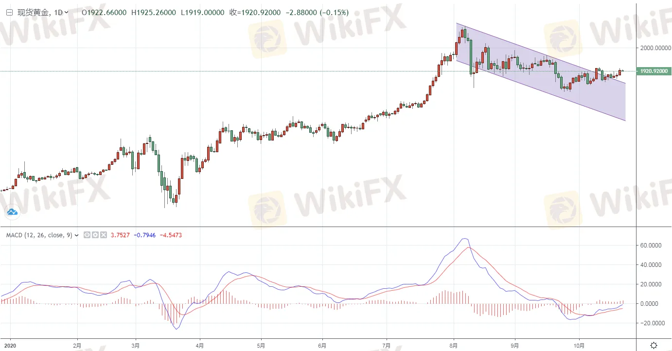 黃金方面,週四(10月22日)亞市早盤,現貨黃金近期持續回升,已經連收三連陽,目前金價位於1920關口上方,暫報1921.11美元/盎司,由於新一輪更大的財政刺 激方案有望出爐,疊加美元持續走弱,避險資金湧入黃金,支撐金價持續回升站上1920關口。