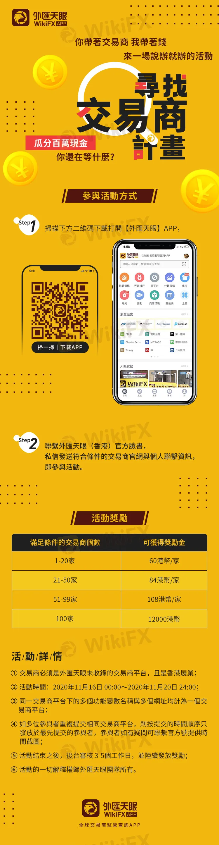 “尋找交易商計劃”將於2020年11月16日00:00正式啟動,參與者只需按照要求向天眼小編提交符合條件的交易商網站,即可瓜分百萬現金。