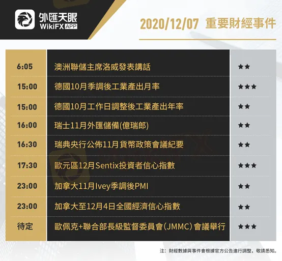 以下為12月7日(週一)重要財經事件,更多資訊,請關注外匯天眼APP或官方網站!