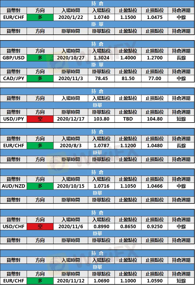 (1)法農銀行歐元/美元多頭持倉止盈出局。