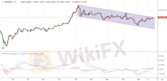 現貨黃金昨日收報1894.24美元/盎司,上漲16.21美元或0.86%,盤中最低觸及1875.88美元/盎司,盤中最高觸及1894.36美元/盎司。今天現貨黃金早盤維持窄幅震盪微幅走低,暫報1893.68美元/盎司。從近期的表現看,金價整體呈現出高位回落的格局,從趨勢看,金價反彈高點不斷被壓低,由於市場對於目前已知的風險已經麻木,致使黃金連續承壓回落。從圖中不難看出,金價目前仍然處於下行通道內運行,近期雖然兩次試圖嘗試向上突破通道束縛,未果,目前再度上攻,目前下方的MACD指標顯示做多動能雖有所減弱,但是短線仍是多頭占優,目前多空競爭膠著,待徹底突破後方向明確可趁勢做多。(僅供參考)