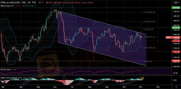 The price of gold has been consolidating below $1,800 since last week after being hurt by a decline in investor inflation expectations.