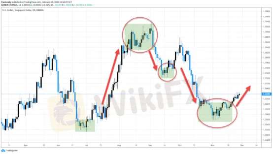 紅色箭頭下降波段角度大動量強勁,在底部形成123反轉結構明顯角度變小做空力量消耗殆盡,市場轉為做多。