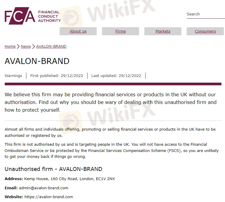 FCA警告稱:AVALON-BRAND 在未經我們授權的情況下在英國提供金融服務或產品,如果一旦遭受資金損失,您將無法使用金融申訴專員服務或受到金融服務補償計劃 (FSCS) 的保護。