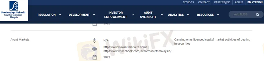 該名單針對Avant-Markets發出示警,原因是「未經許可從事證券交易的資本市場活動」。