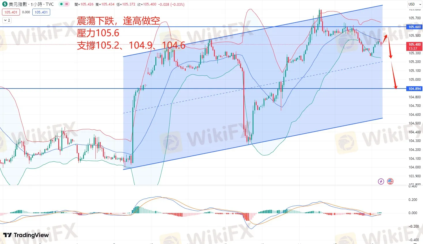 美元指數隔夜震蕩走跌,今日建議繼續逢高做空。建議關注壓力105.6和105.8區域。下方支撐關注105.2和104.9,其次104.6通道底部支撐區。