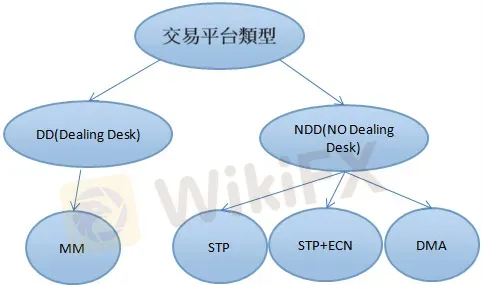 線上外匯交易平台從大類分有兩種: 有處理平台模式(Dealing Desk,簡稱DD)和無處理平台模式(No Dealing Desk , 簡稱 NDD),其中 無處理平台模式(NDD)的外匯交易平台還可以進一步細分為STP、DMA/STP和ESC+STP。如下圖所示。