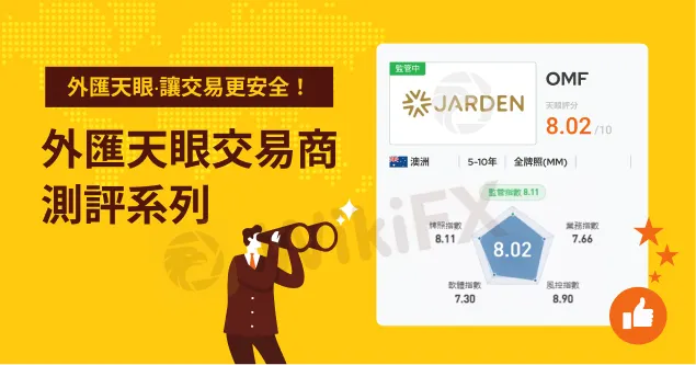 透過外匯天眼官網查詢OMF,可以看到這家交易商的LOGO與網址都是JARDEN,看起來應該是公司合併。該平台成立5-10年,持有澳洲ASIC全牌照,但是在台灣缺乏有效監管,而且沒使用MT4/MT5交易軟體,因此具有中級風險隱患,天眼評分文8.02。