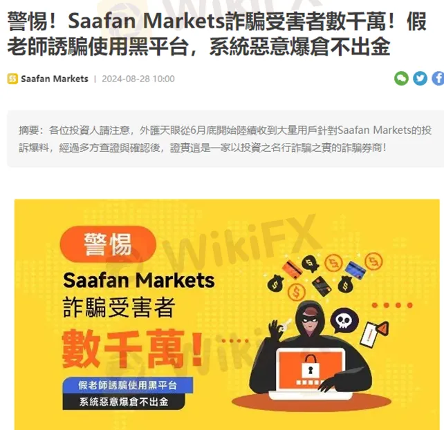 摘要:上個月底,外匯天眼發布了曝光文「警惕!Saafan Markets詐騙受害者數千萬!假老師誘騙使用黑平台,系統惡意爆倉不出金」,提到一位投資人因誤信假投資廣告而參加「520複利計畫」並入金到Saafan Markets,結果遭到惡意爆倉的經過,以此提醒用戶留意這家外匯券商。今天我們要繼續分享另外一位外匯天眼用戶遭到詐騙的經過,幫助大家更了解Saafan Markets的犯罪手法。