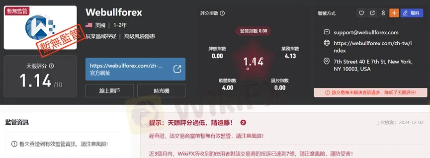 各位外匯天眼用戶請注意,我們收到關於仿冒Webull微牛證券的黑平台爆料,仿冒券商名稱為Webullforex,網址是https://webullforex.com/zh-tw/index。根據外匯天眼收錄的資料,這個黑平台成立僅1-2年,目前展業區域存疑且缺乏有效監管牌照資訊,有過多未解決客訴,因此監管指數、牌照指數、風控指數都是0,天眼評分相當低,只有1.14。