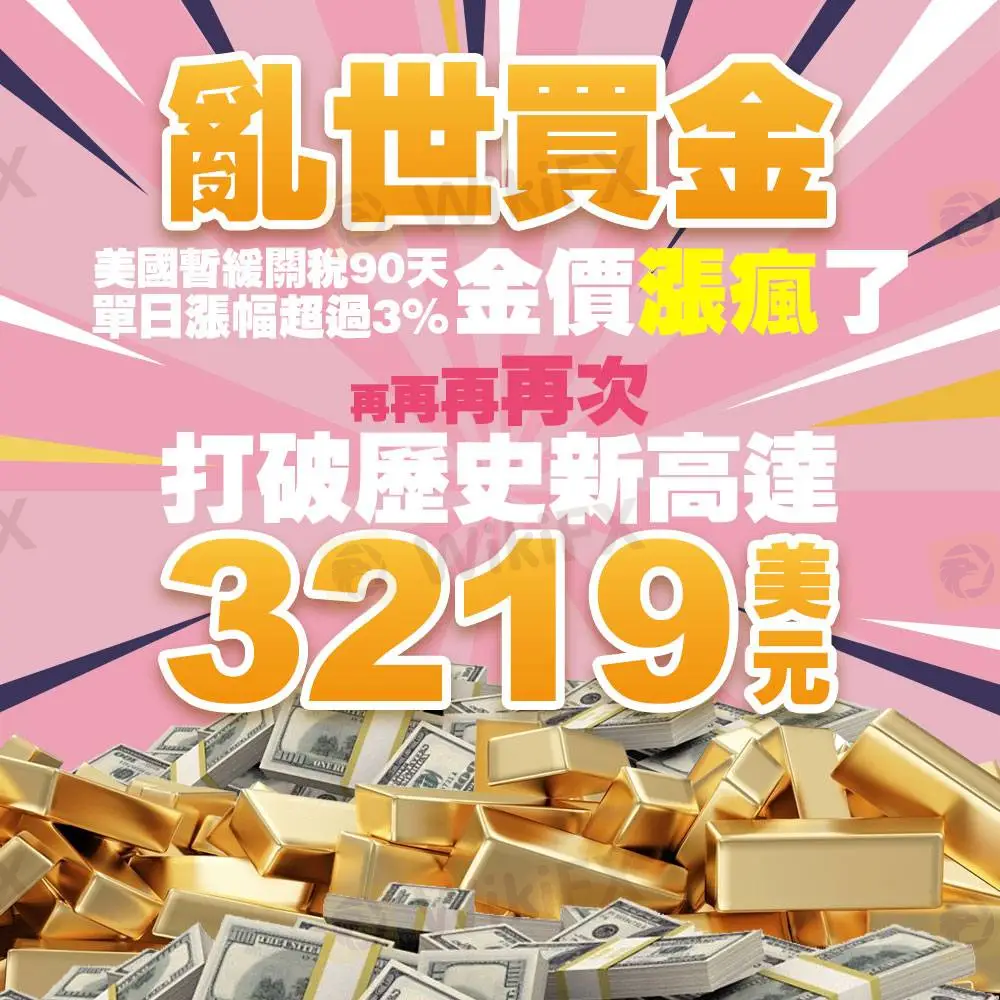 摘要:美國暫緩關稅90天,金價漲發瘋了,單日升超過3%再再再再次打破歷史新高達3219美元