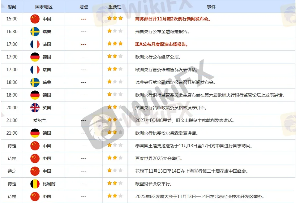 摘要:CWGMarkets市場資訊 2025年11月13日(週四):匯訊摘要:周三,因交易員們評估美國政府恢復運轉後,大量經濟數據公布將對美國聯儲局利率政策產生何種影響,美元指數先升後跌,最終接近平收,報99.46;基準的10年期美債收益最終收報4.075%,對美國聯儲局政策利率敏感的2年期美債收益率收報3.576%;美元兌日元一度站上155,為2月以來首次。周三(11月12日)黃金單日暴漲近2%,強勢
