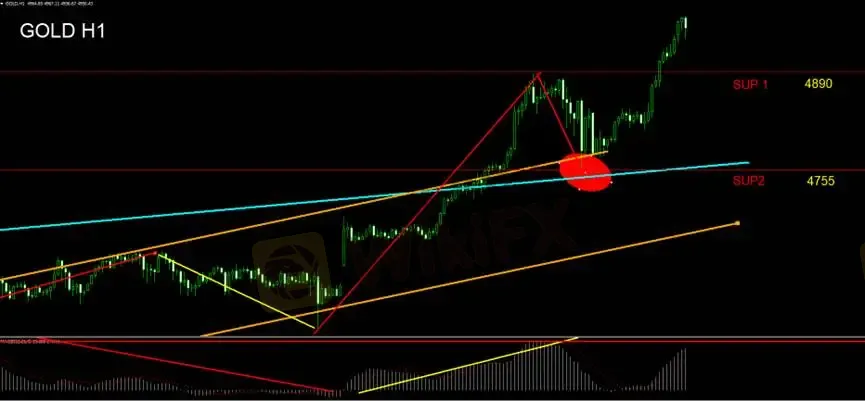 採取1小時技術面觀察,黃金突破中型上升通道(藍線)、小型上升通道(橘線)回踩通道上緣後重新創下波段新高。我們仍認為當前為超漲階段,短期趨勢為高過高、底不破低。